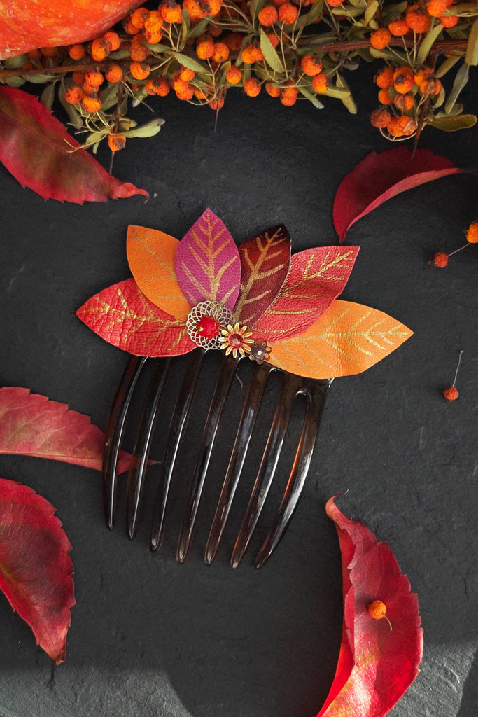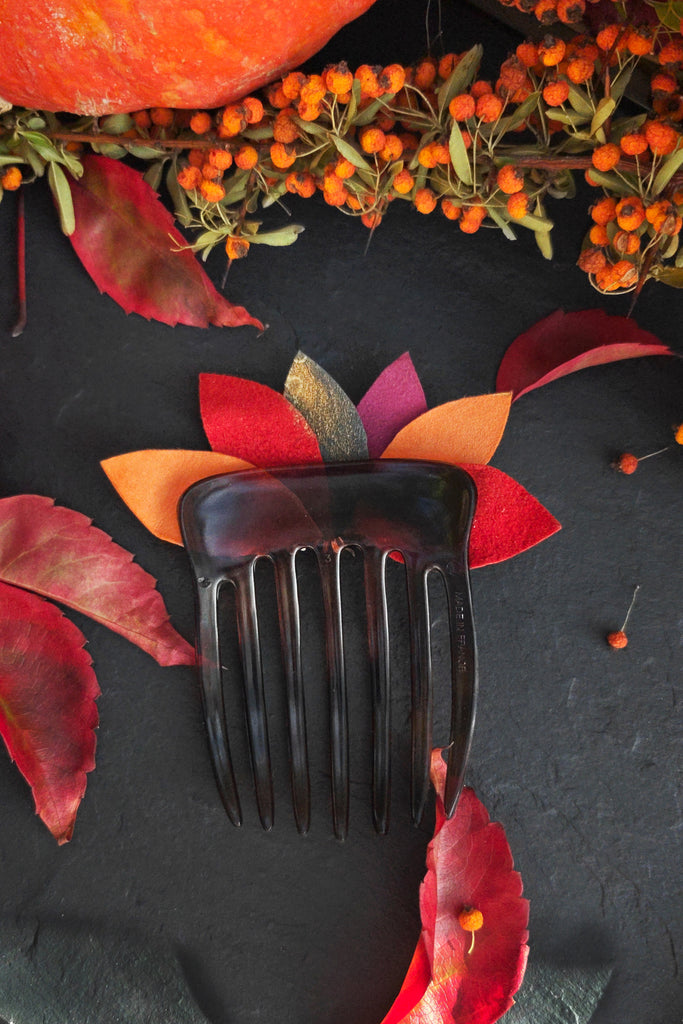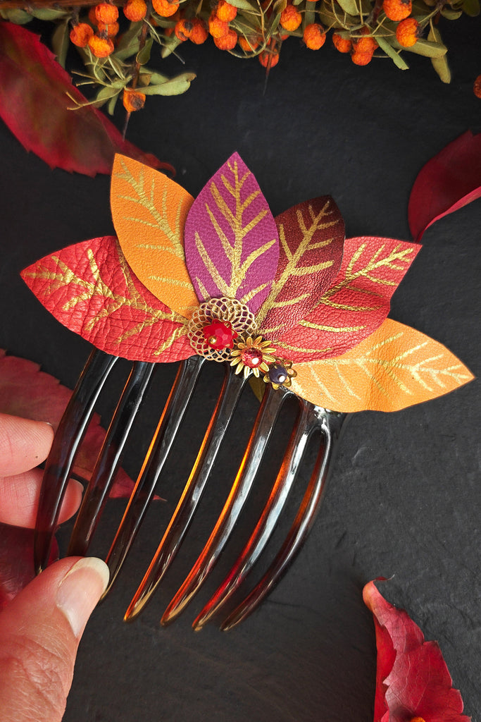Ce grand peigne avec son éventail de feuilles flamboyantes donne à n'importe quelle coiffure une grâce féerique. Chaque feuille est patiemment découpée dans des chutes de cuirs provenant d'ateliers de maroquinerie français et chaque nervure dorée est peinte à la main.