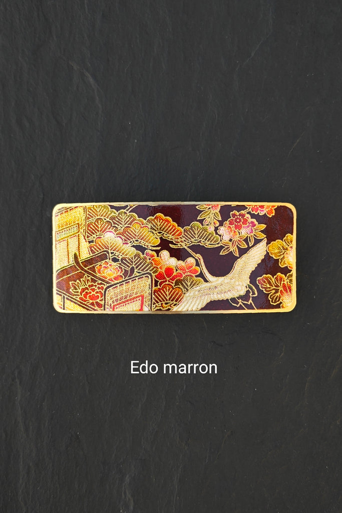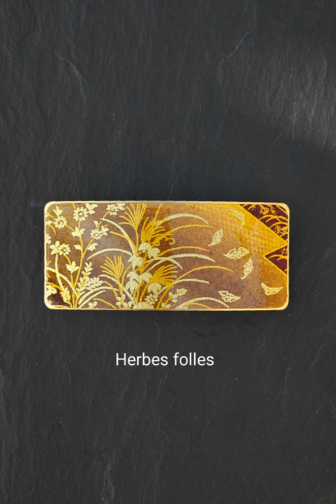 Grande barrette à cheveux en métal doré – Motifs japonais jaunes et marrons