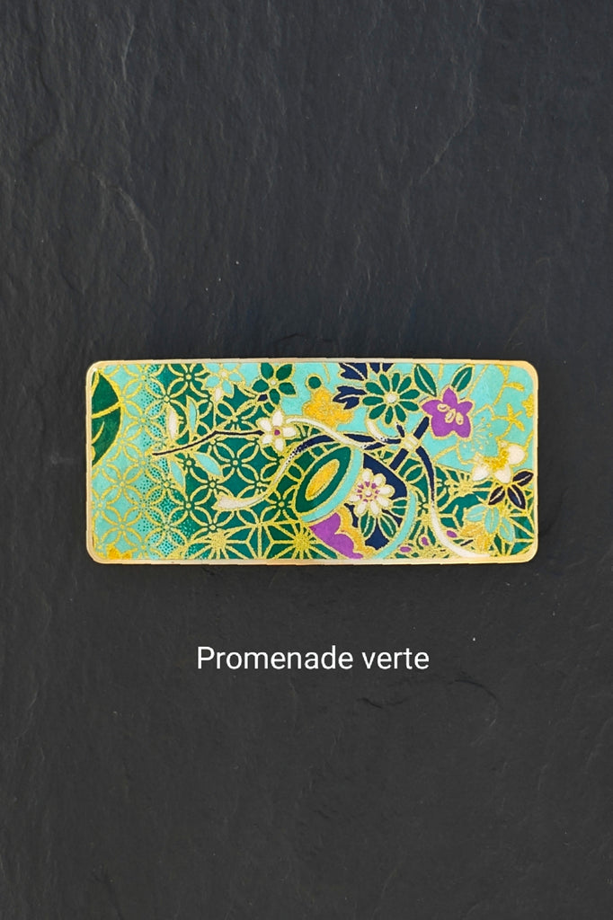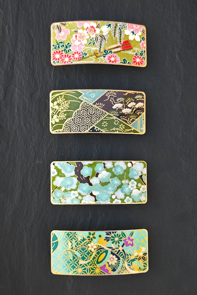 Grande barrette à cheveux en métal doré – Motifs japonais verts