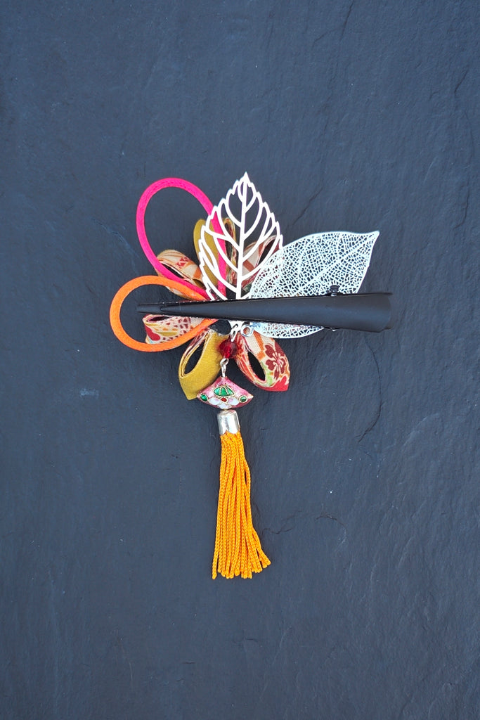 Découvrez cette jolie pince à cheveux en tissu japonais pour orner vos coiffures. C'est une grande fleur réalisée en tissu avec la technique du "tsumami zaïku kanzashi".