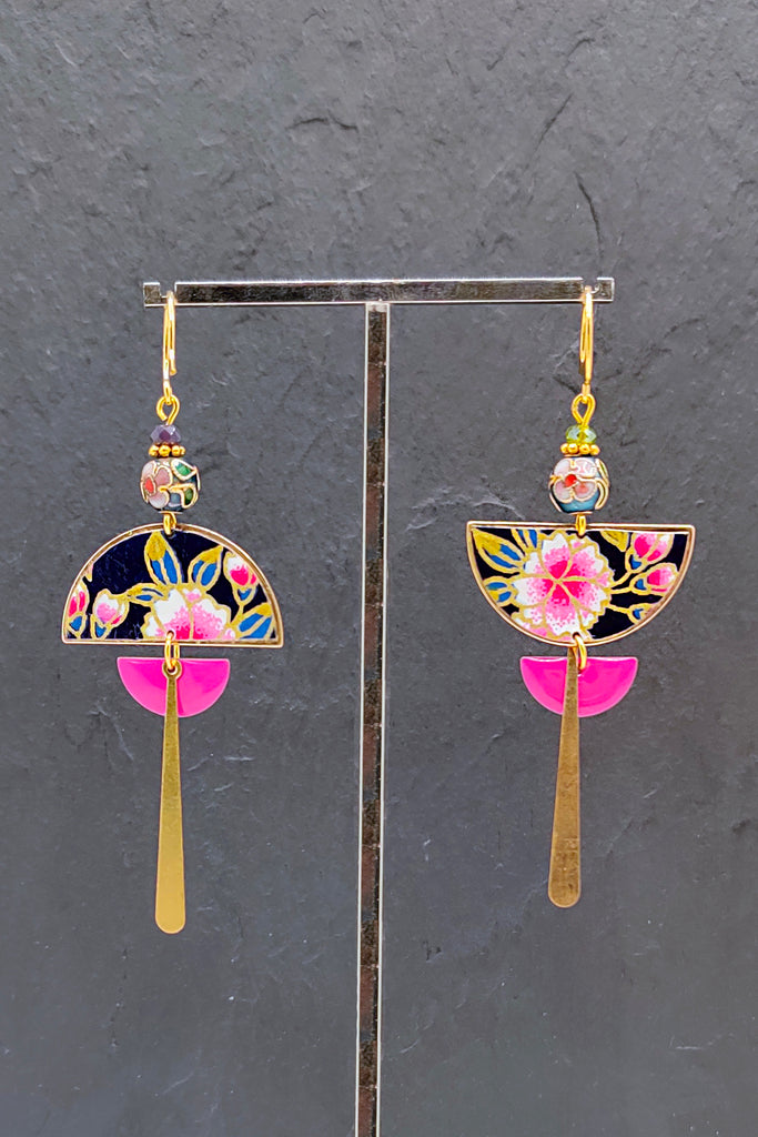 Le pendentif est composé de deux demi lunes, une en Washi laqué, l'autre rose et rose; de perles en émail cloisonné bleues ainsi que d'une pampille dorée.
