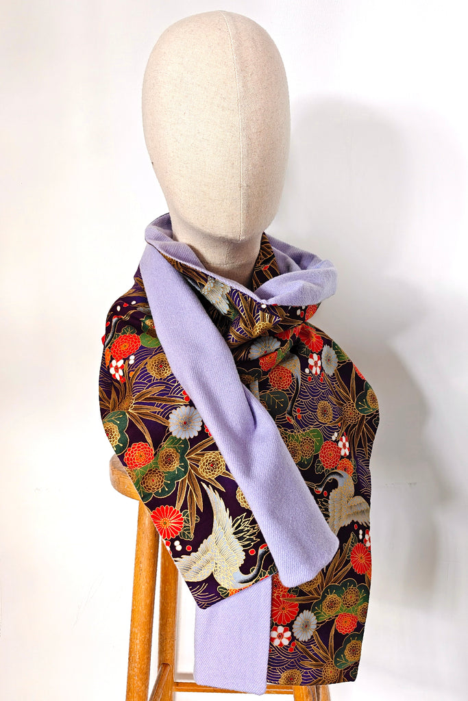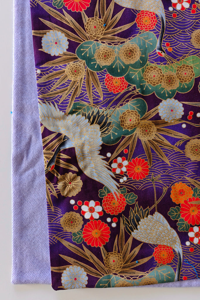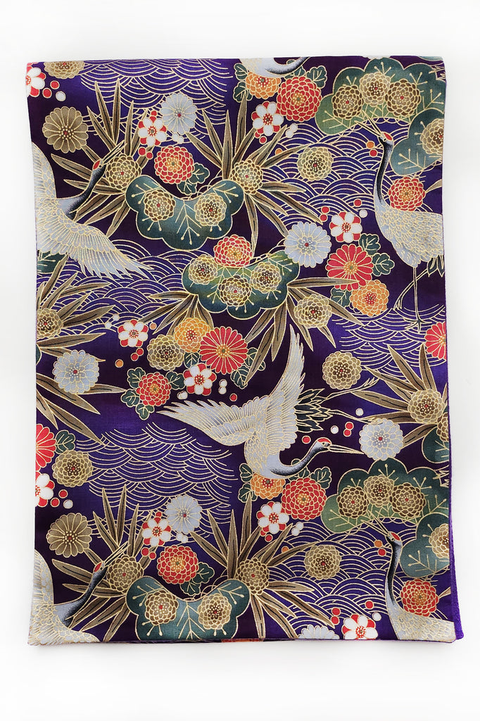 Large Japanese scarf in purpple cotton printed with a crane and pine tree pattern.