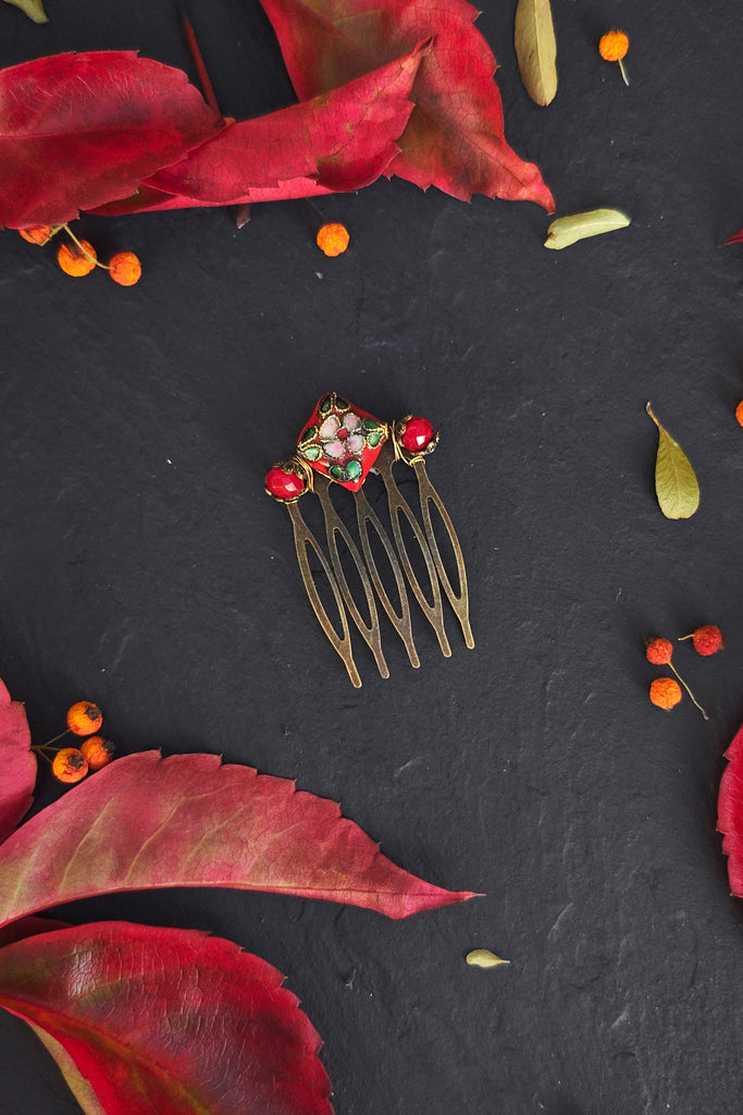 This mini comb is a true gem, perfect for holding a strand of hair to the side or adding a touch of whimsy to your hairstyle. It features a central cloisonné enamel bead surrounded by deep red glass beads.