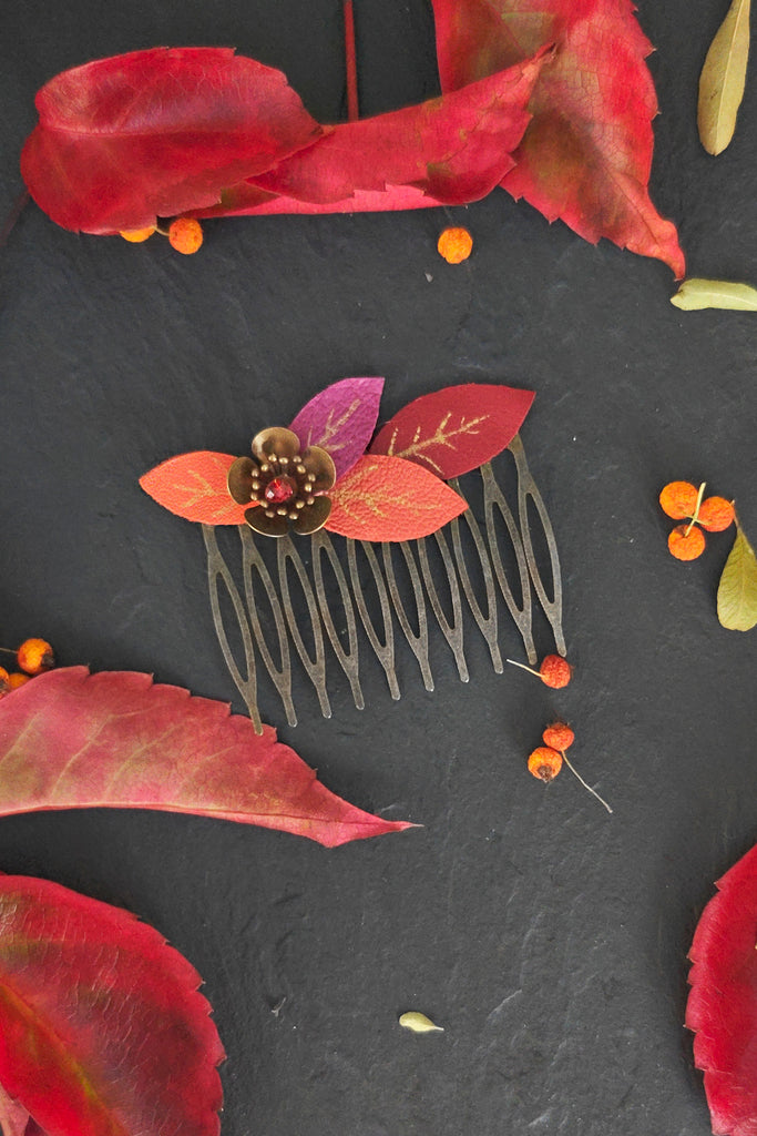 This small comb, adorned with warm-colored leaves, is perfect for tucking a strand of hair to the side or adding a touch of whimsy to your hairstyle. Each leaf is meticulously cut from leather scraps sourced from French leather workshops, and each gilded vein is hand-painted.